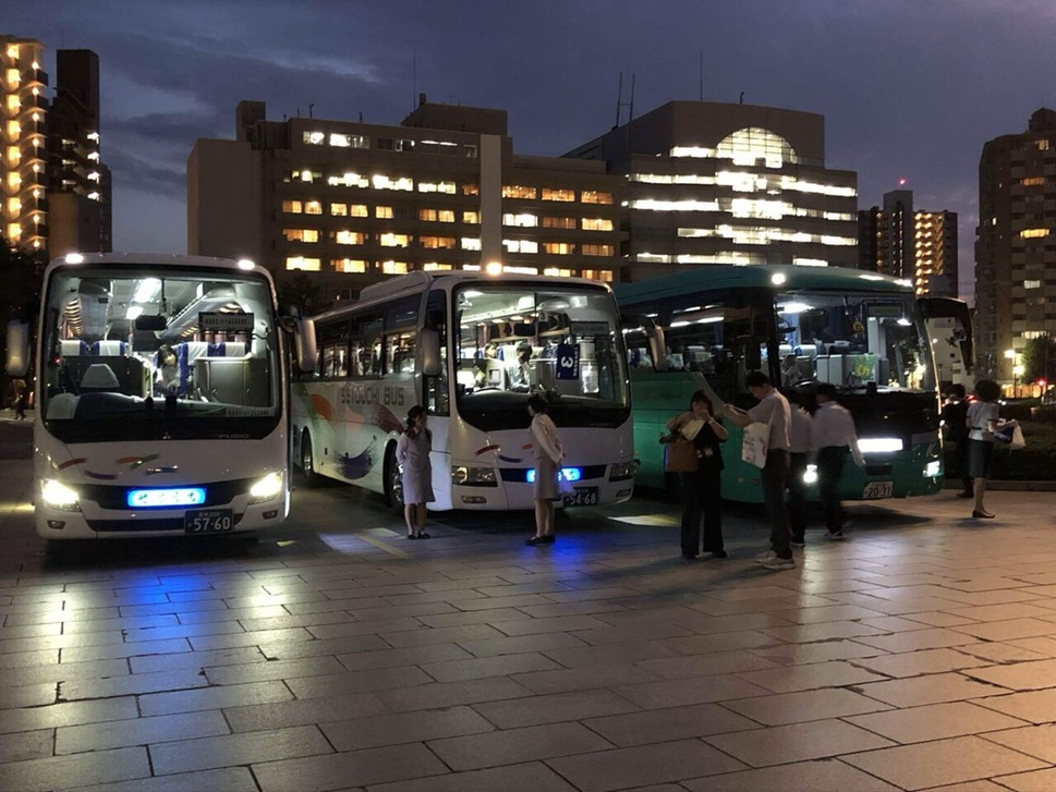 初日の見学がすべて終わりました。バスで、夕食会場へ移動でします。