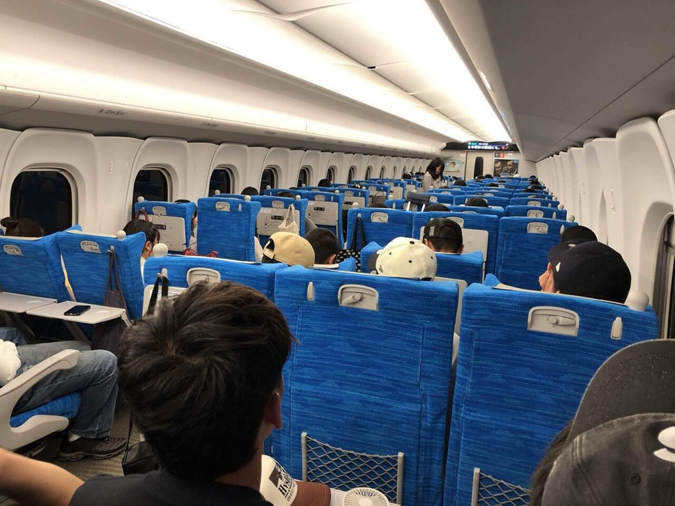 クラス別研修の後は、USJが控えているので、新幹線の中では充電中?の生徒が多いようです。